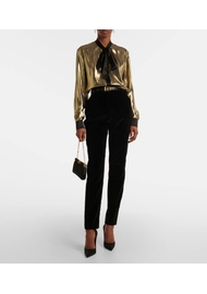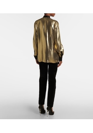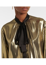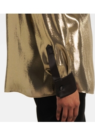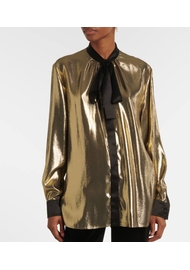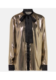 Material: 78% silk, 22% polyester. Care instructions: dry clean. Made in Italy. Designer color name: Oro. Closure: concealed buttoned front. Cuff: one button. Self-tie collar. Silk.